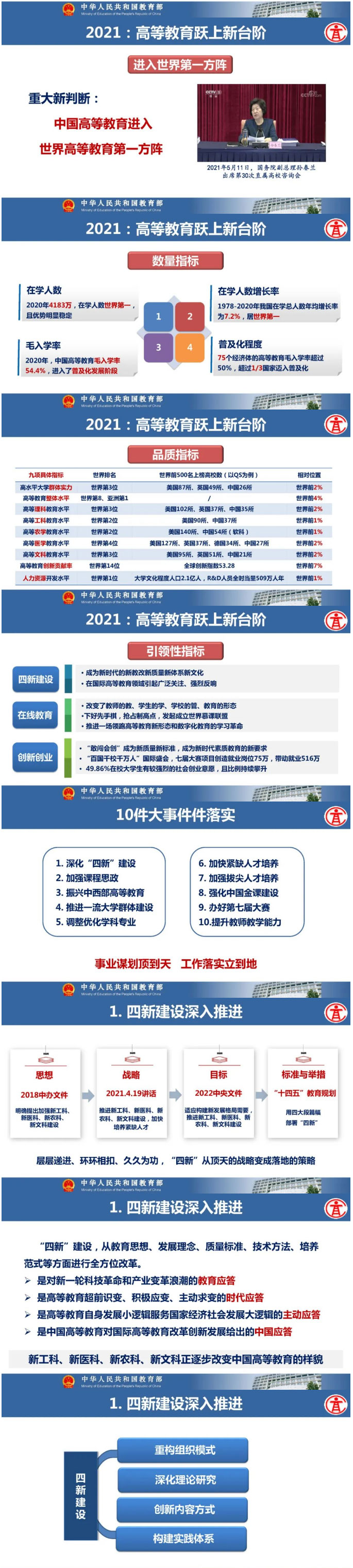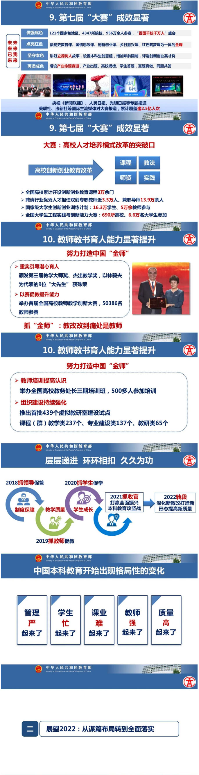 教育部高等教育司司长吴岩作主题报告,盘点总结2021年的工作,强调2022年要转段:要从战略上、策略上、大逻辑、小逻辑、工作成效上全面转段。要抓基础、抓新形态、抓高地、抓洼地、抓引领,从实施新时代高等教育育人质量工程、卓越拔尖人才培养、高等教育数字化、中西部高等教育振兴、“互联网+”大赛等五方面的战略任务,抓好20件大事的落实,让中国高等教育质量更高、实力更强、品牌更亮!