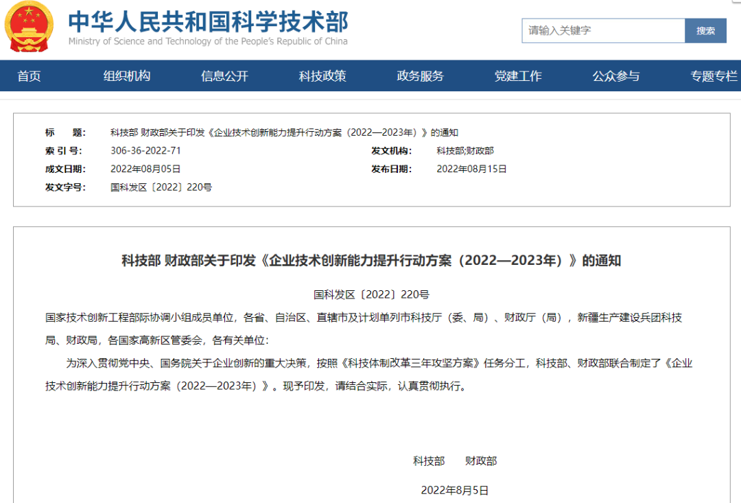 科技部 财政部关于印发《企业技术创新能力提升行动方案(2022—2023年)》的通知