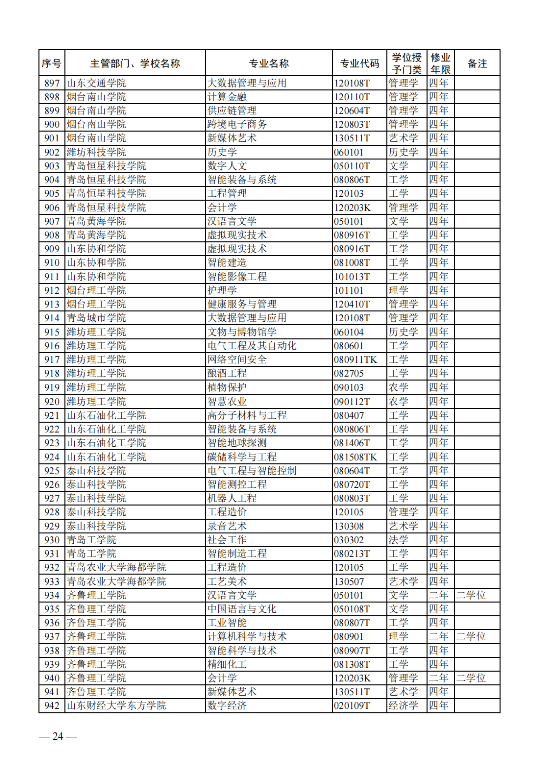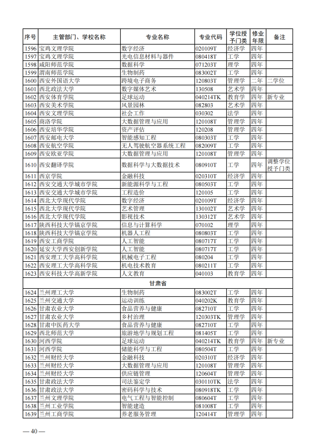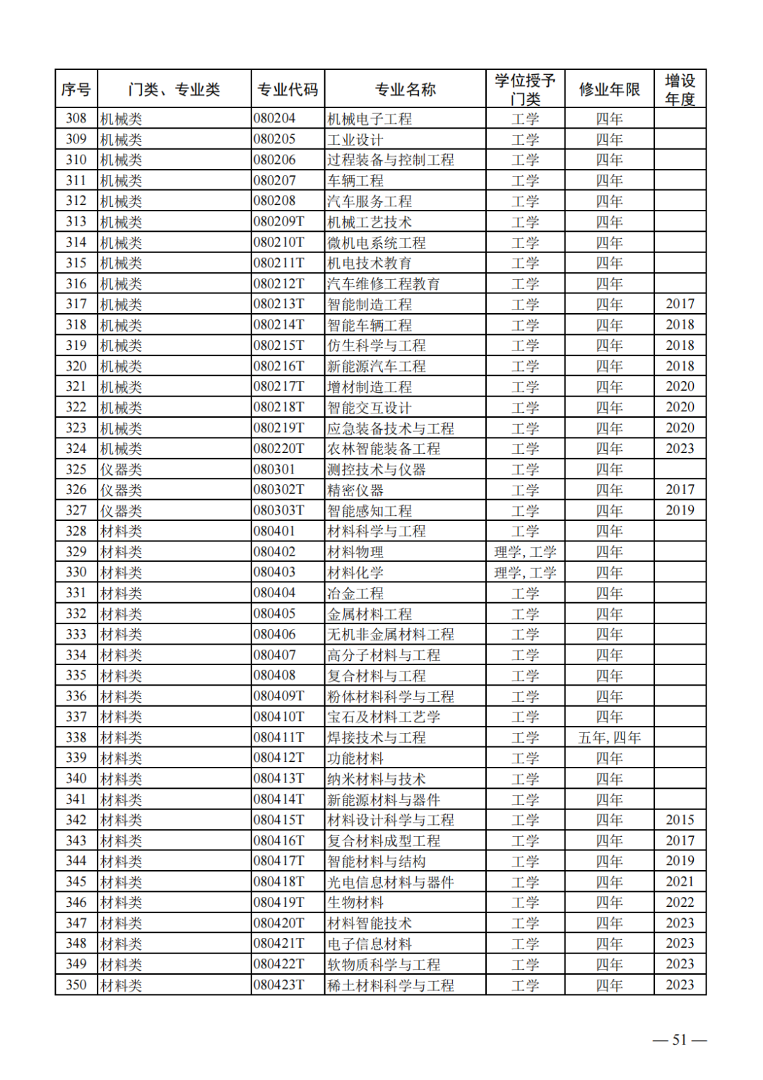 按照教育部等五部门印发的《普通高等教育学科专业设置调整优化改革方案》(教高〔2023〕1号)有关要求,根据《普通高等学校本科专业设置管理规定》(教高〔2012〕9号),我部组织开展了2023年度普通高等学校本科专业设置和调整工作。经申报、公示、审核等程序,对各地各高校向我部申请备案的专业予以备案;根据高等学校专业设置与教学指导委员会评议结果,确定了同意设置的国家控制布点专业和尚未列入专业目录的新专业名单,并将资源勘查工程、护理学、助产学调整为国家控制布点专业。现将备案和审批结果(附件1)、《普通高等学校本科专业目录(2024年)》(附件2)一并予以公布。请各地各高校加强对新设专业的建设和管理,不断提高人才培养质量。
